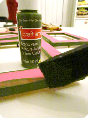 1) I had painted my frames hot pink to go with the decor in my studio before I did my mini-makeover. Now they're just too loud. I started by painting the inside and outside edges. Don't worry about the flat front part, we're going to cover that with paper later.