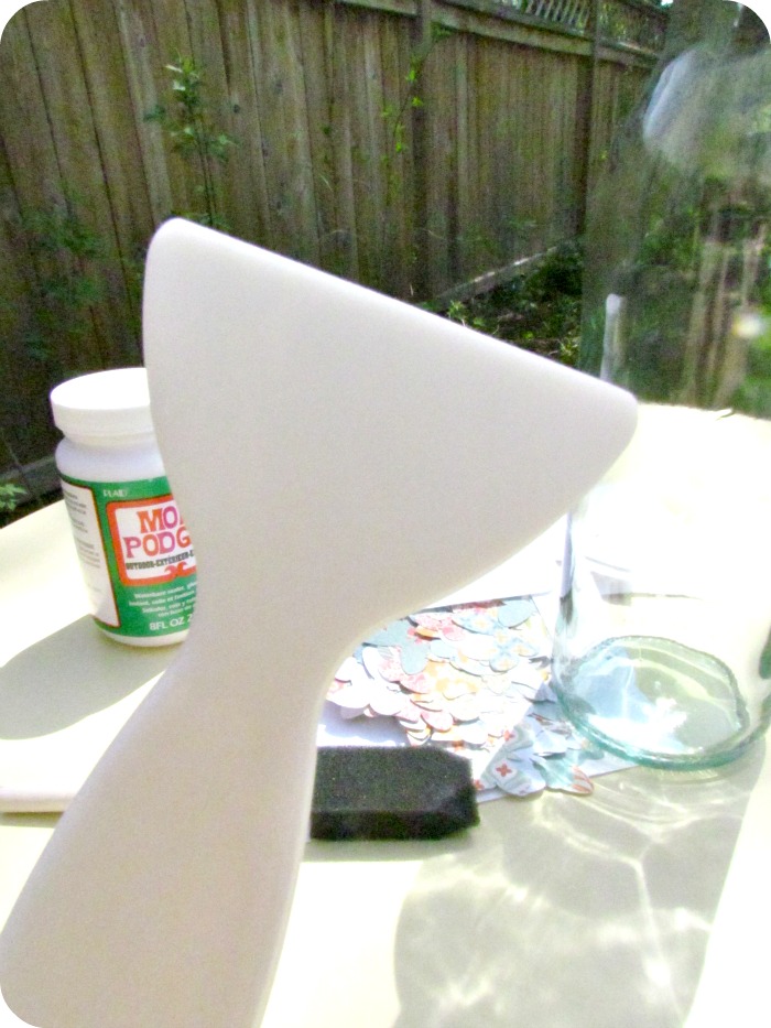 3) Paint on your first layer of Mod Podge, adding paper shapes as you go. Use your sponge brush to